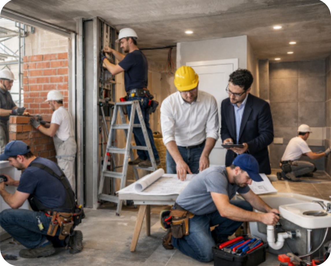Entourés d’une équipe qualifiée d’artisans spécialisés (maçonnerie, plomberie, électricité, revêtements, menuiserie…), nous coordonnons l’ensemble des interventions afin de garantir qualité d’exécution, respect des délais et cohérence technique.